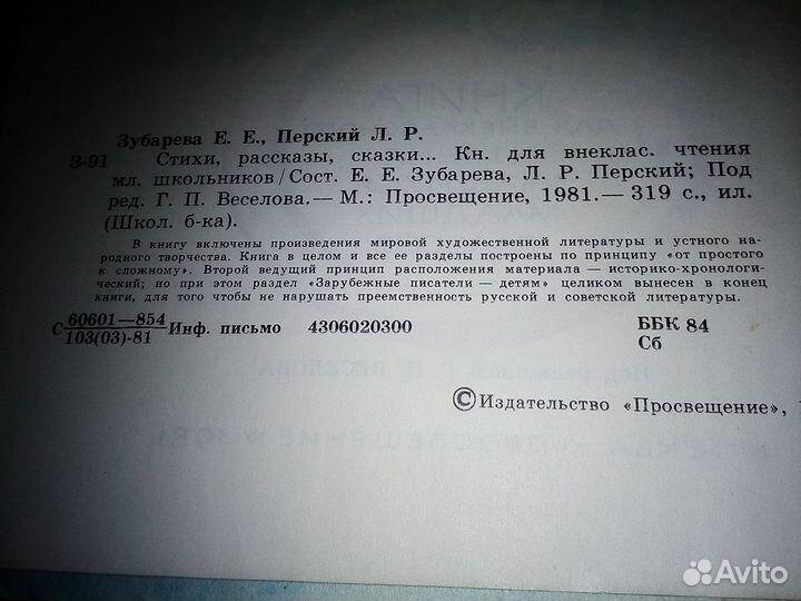 "Стихи, рассказы, сказки" 1981 год, в удовлетворительном состоянии, твердый переплет, небольшой разрыв вначале книги(на фото видно, легко лечится) в остальном в порядке. Все страницы. Дополнительные фото по запросу.