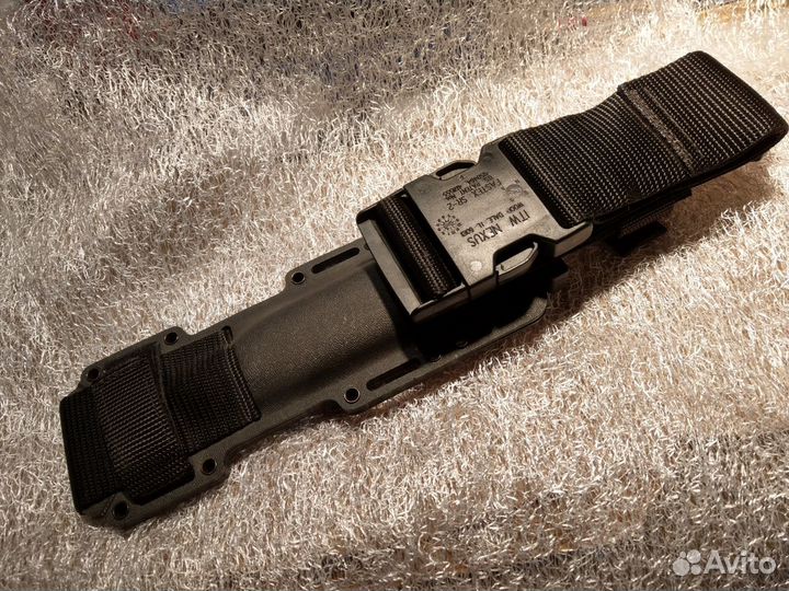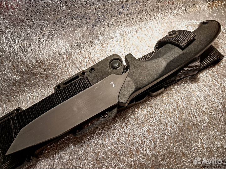 Его ножны выполнены из кайдекса, хорошо продуманны разные варианты ношения, нож в ножнах надежно фиксируется от выпадения и очень удобно без лишних движений вынимается из них.Ручка сделана очень удобнос вырезом по палец, что бы получился полный обхват в кулак в тыльной стороне которого получается металлический пятак-глушилка .