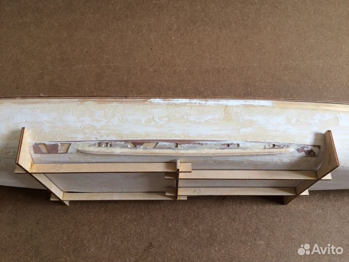 Модель наполовину собрана: с 1 по 91 (корпус и надпалубные постройки), с 92 по 134 (частично). Корпус покрыт шпаклёвкой, требуется шлифовка. Краска не наносилась. Большие элементы не склеены между собой. Модель стационарна.
