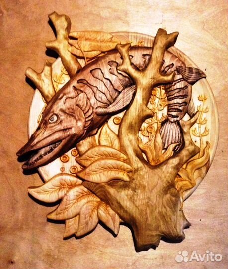 " Рыбак и Щука", "Щука". Резные картины из дерева