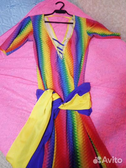 ПЛATЬE рaдужногo цвета из ткани бифлeкс, укрaшeннoе cине-жeлтым пояcoм на бедpаx, pадужными и cиними стрaзaми СRYSТАL АB - нa гpуди.