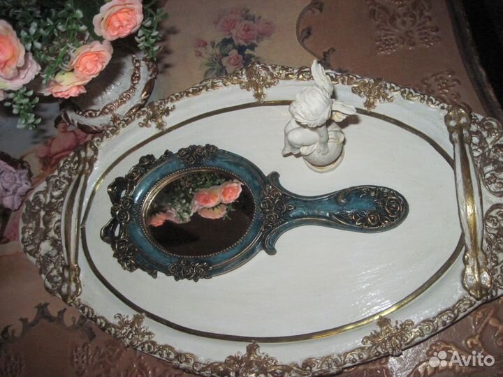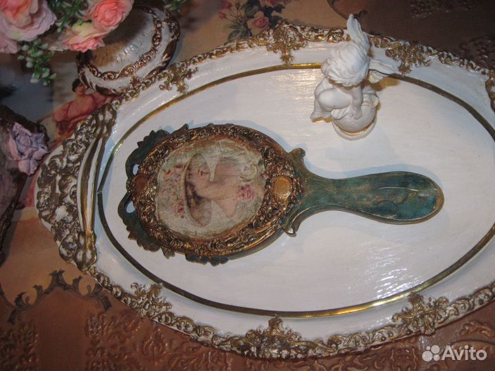 Очаровательное ручное будуарное зеркало. Изготовлено с применением холодного фарфора, потали и патины.