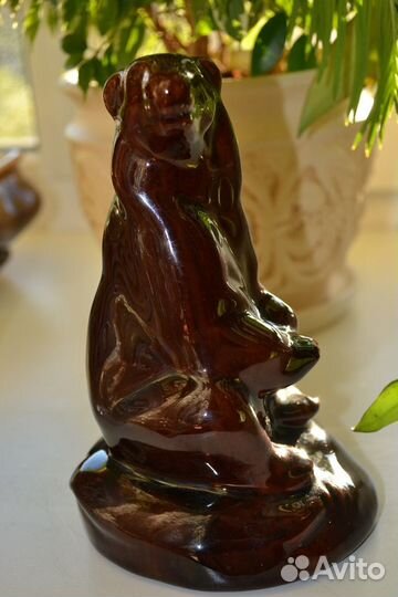 Статуэтка Медведь на рыбе керамика, старая Гжель (СССР 60-е годы), высота 19 см. Красивейшая шоколадная глазурь.